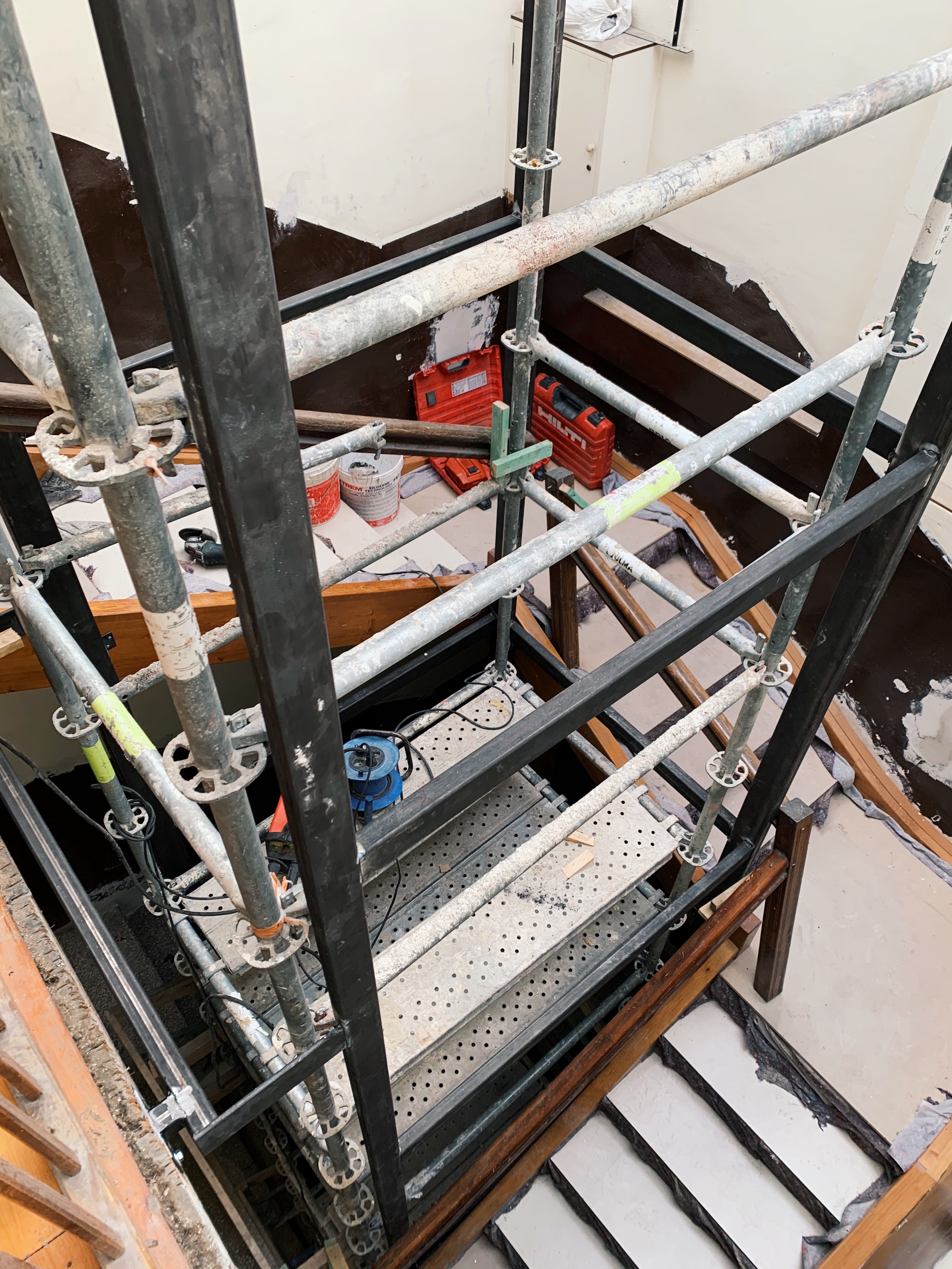 La obra implico la demolición en parte de las escalera de hormigón y rehacer los tramos de escalera de madera de acceso a planta bajo cubierta, rehacer el portal, asi como la modificación de instalaciones principales de edificio que coincidian en la nueva ubicacion del ascensor. Y todo ello con los propietarios viviendo en el edificio y con una pandemia COVI.
